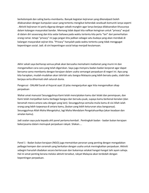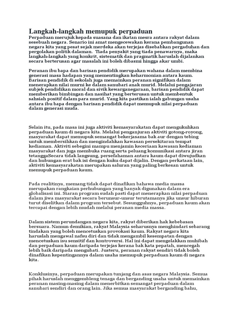 Aspek tersebut menjadi penyumbang kepada perkembangan pemakanan yang mempengaruhi perpaduan kaum di malaysia. Malaysia sebelum berdiri teguh sebagai negara membangun telah melalui pengalaman pahit. Tapak karangan pmr 1 : Dalam konteks kepelbagaian ini, perpaduan rakyat malaysia sememangnya penting. Perpaduan dalam kalangan pelbagai etnik di negara kita haruslah dikekalkan untuk menjamin kselamatan negara agar kemerdekaan yang kita kecapi sekarang ini berkekalan.